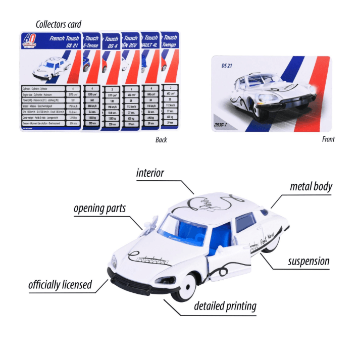 Những chiếc xe trong dòng MAJORETTE French Touch Premium Cars đều được mô phỏng dựa trên các mẫu xe nổi tiếng như DS7, RENAULT 4L, DS21, CITROEN 2CV, DS4, RENAULT TWINGO – biểu tượng của ngành ô tô Pháp. Một số mẫu còn có thể mở được cửa hoặc nắp capo, mang lại cảm giác chân thật và thú vị khi trưng bày hoặc chơi.